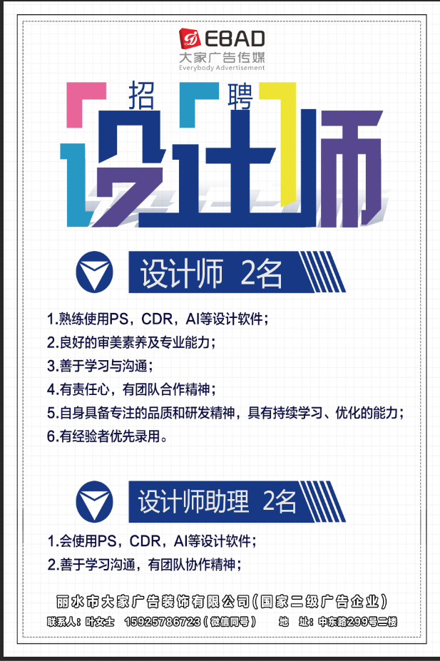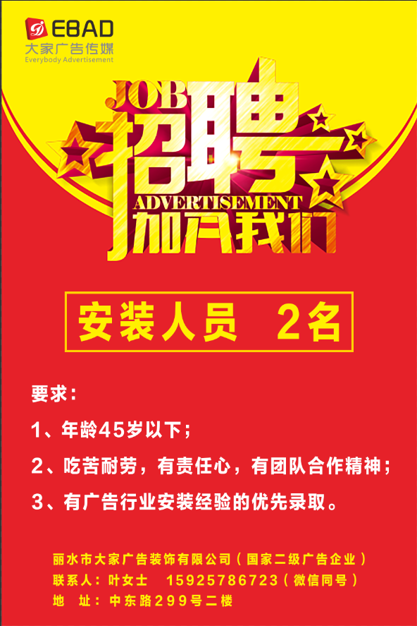 | 其它要求 | 1、年齡45歲以下; 2、吃苦耐勞,有責(zé)任心,有團(tuán)隊(duì)合作精神; 3、有廣告行業(yè)安裝經(jīng)驗(yàn)的優(yōu)先錄取。 ![]() |